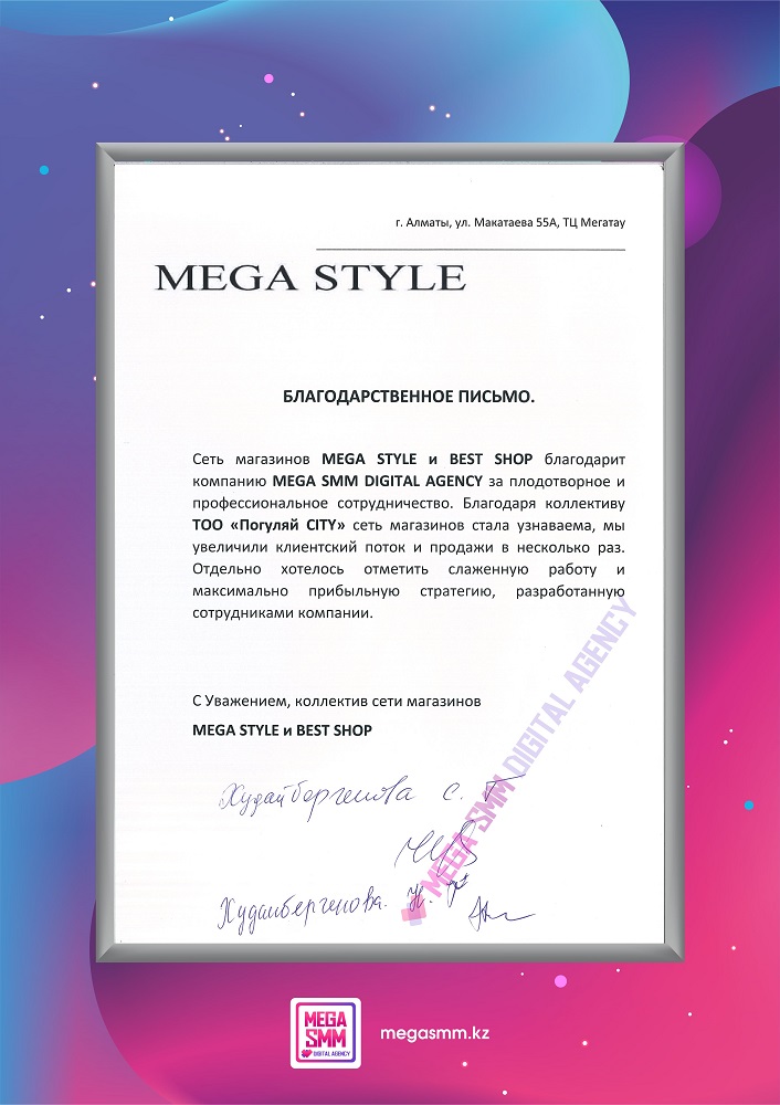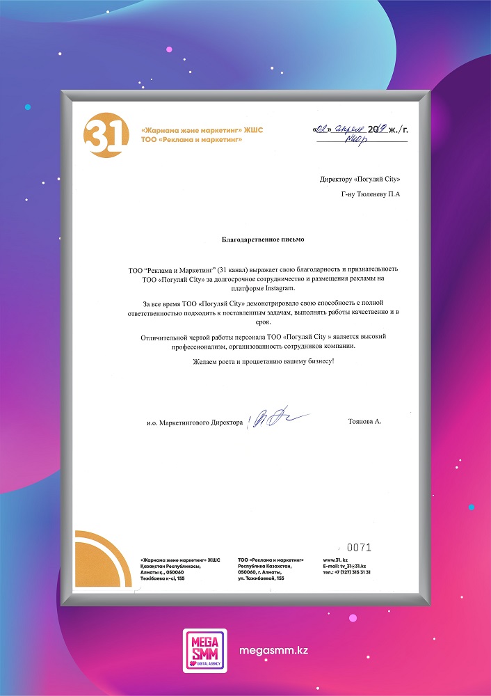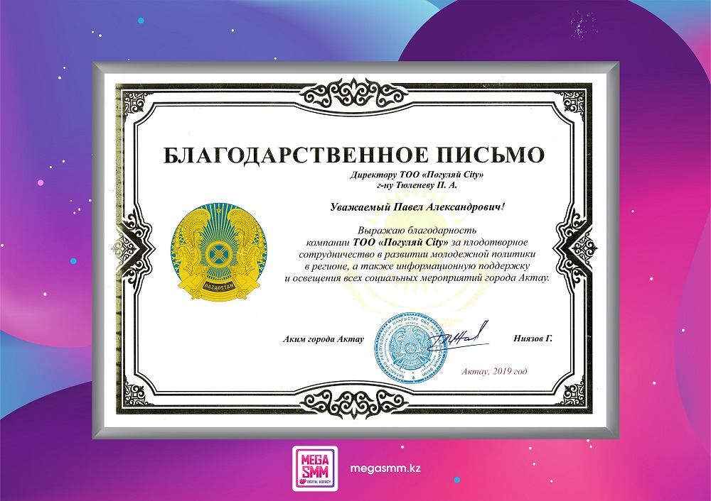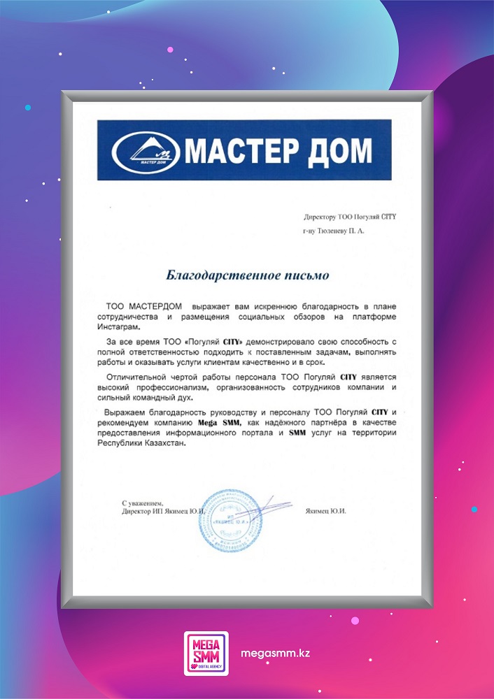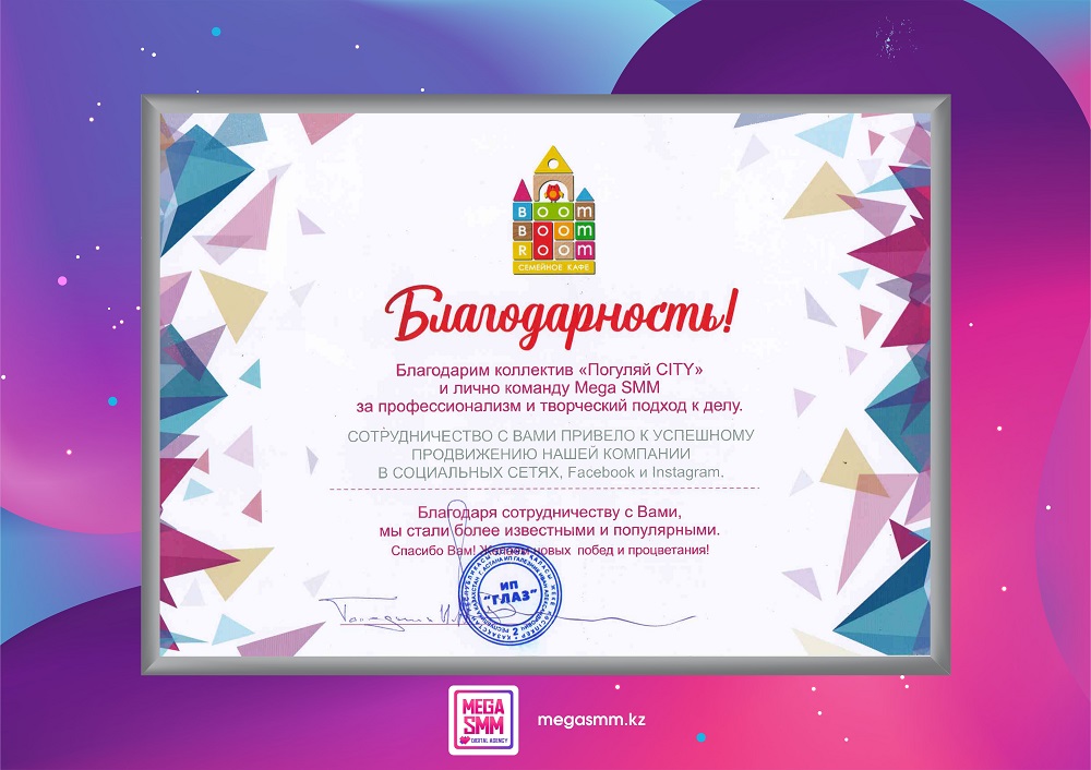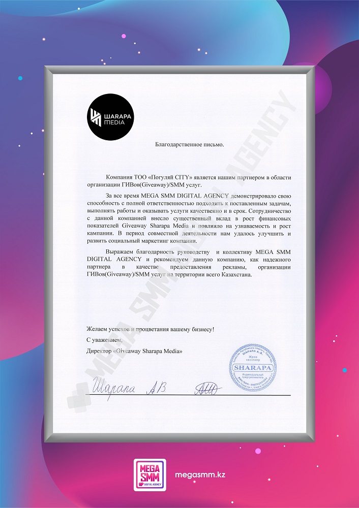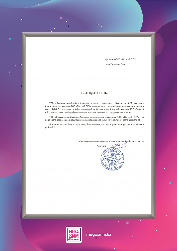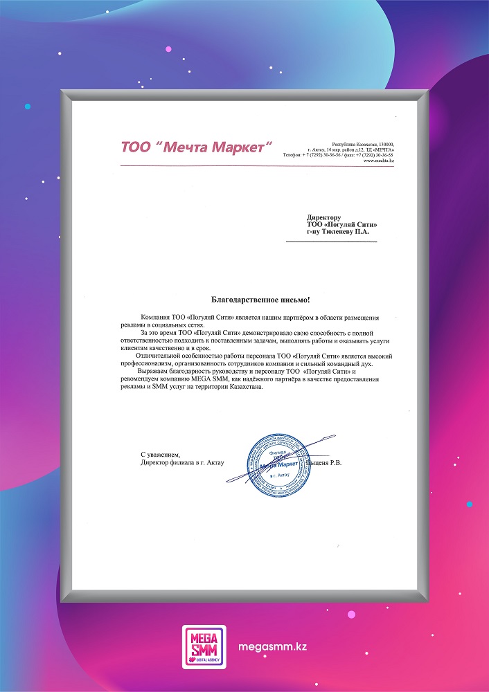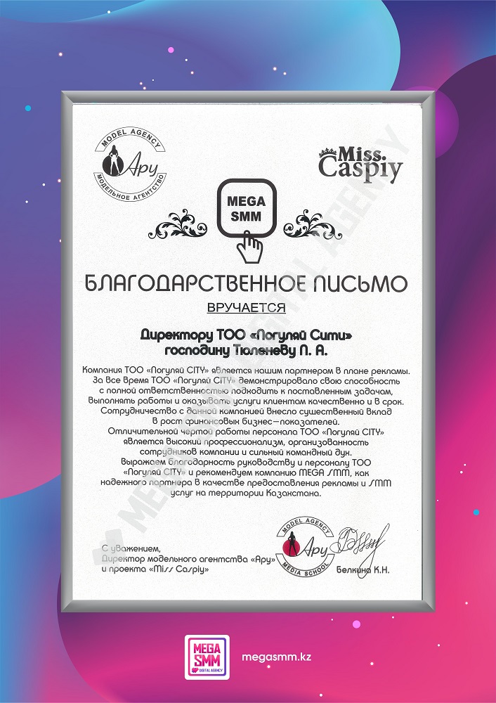 Выражаем благодарность руководству и персоналу ТОО «Погуляй CITY» и рекомендуем компанию MEGA SMM, как надежного партнера в качестве предоставления рекламы и SMM услуг на территории Республики Казахстан.