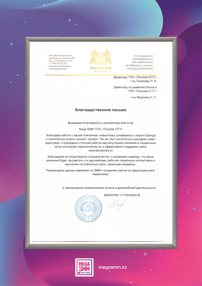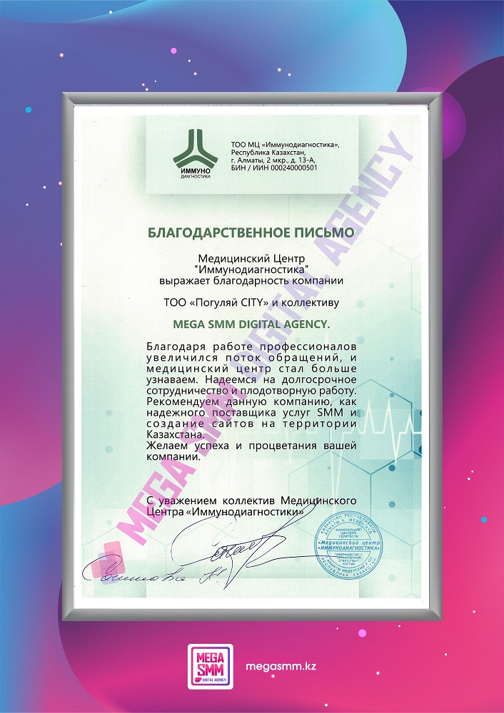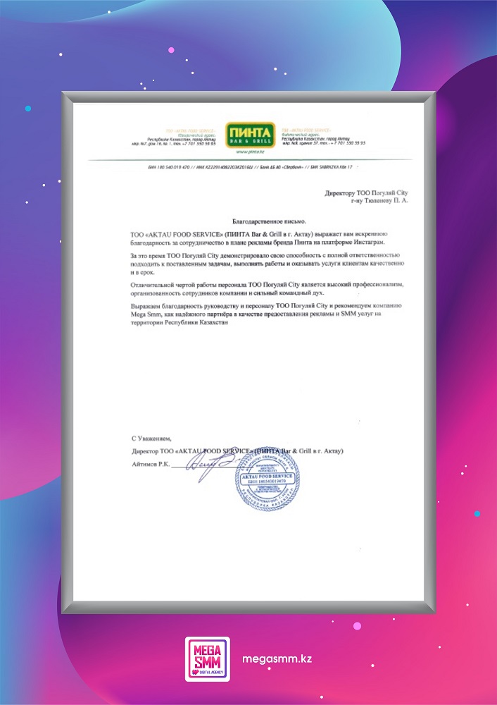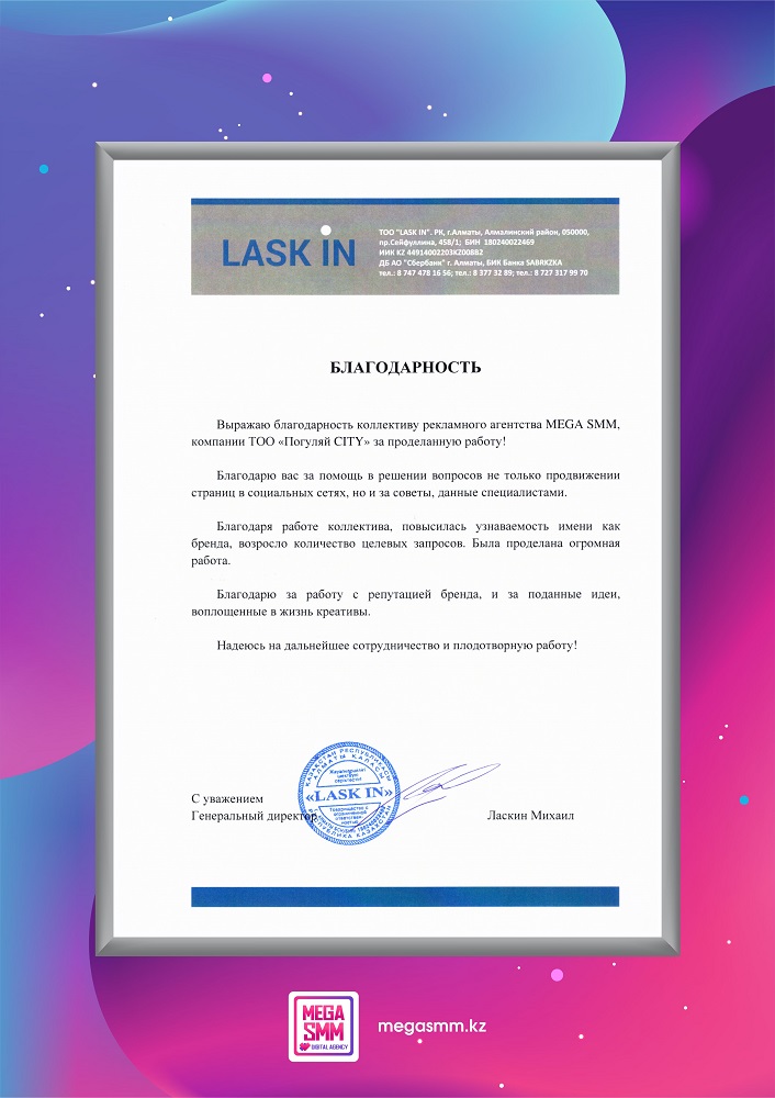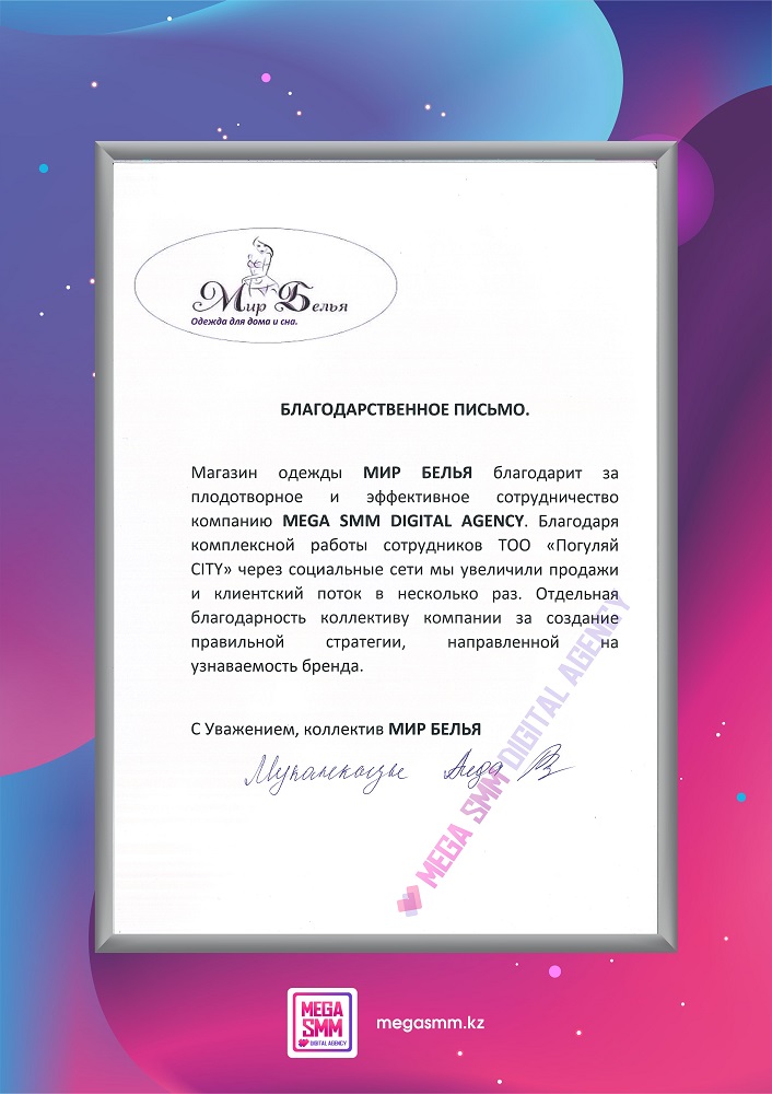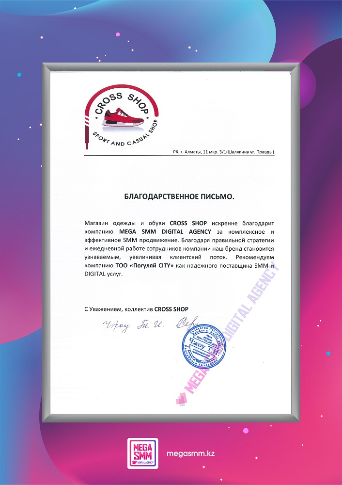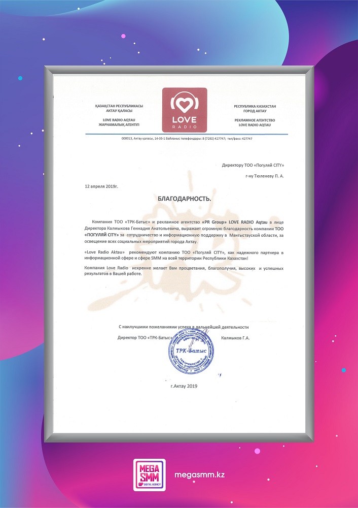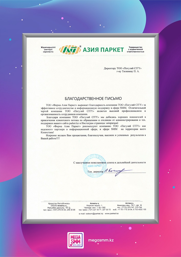 Выражаем благодарность руководству и персоналу ТОО «Погуляй CITY» и рекомендуем компанию MEGA SMM, как надежного партнера в качестве предоставления рекламы и SMM услуг на территории Республики Казахстан.