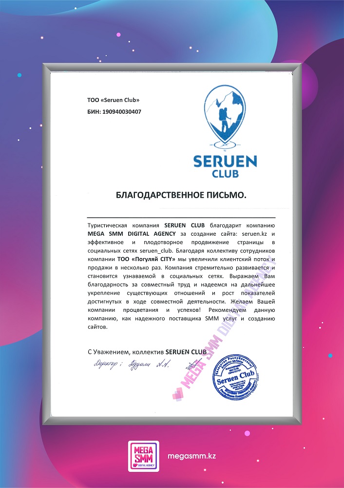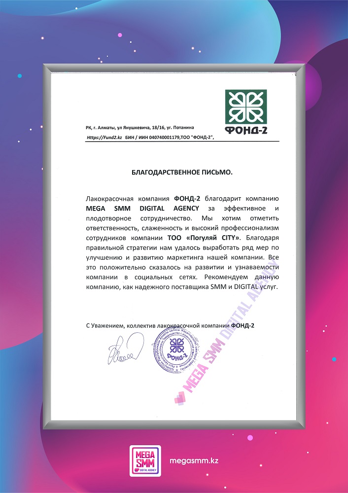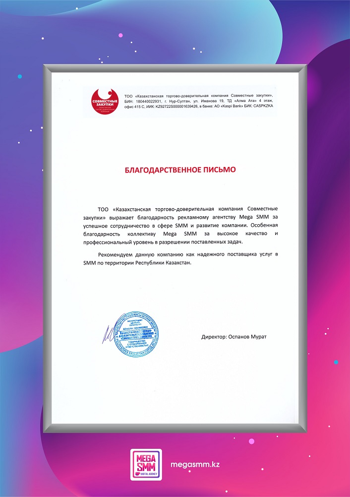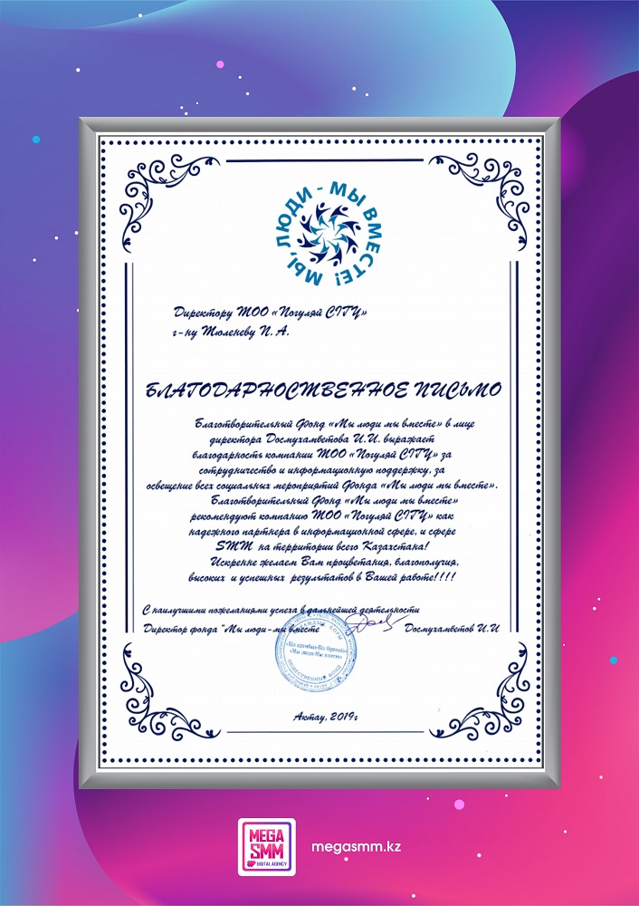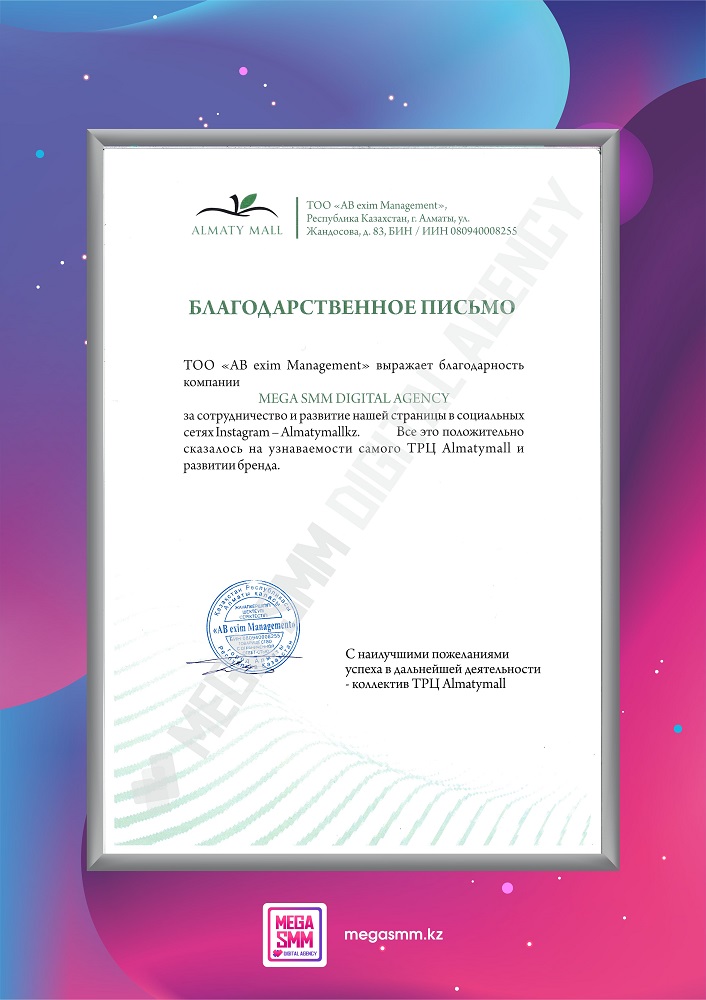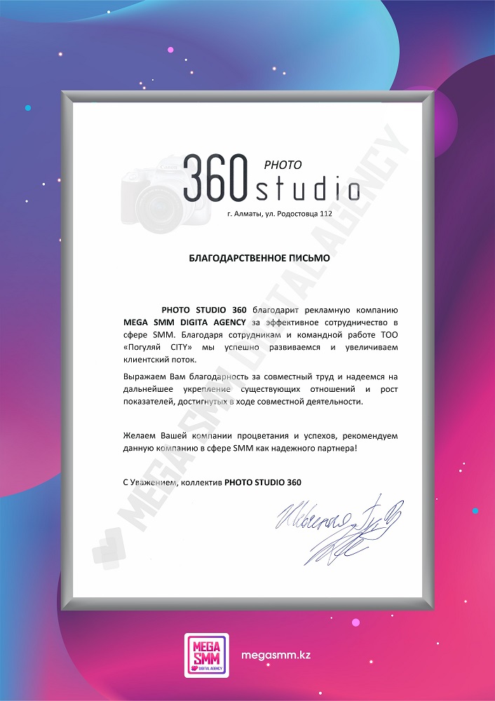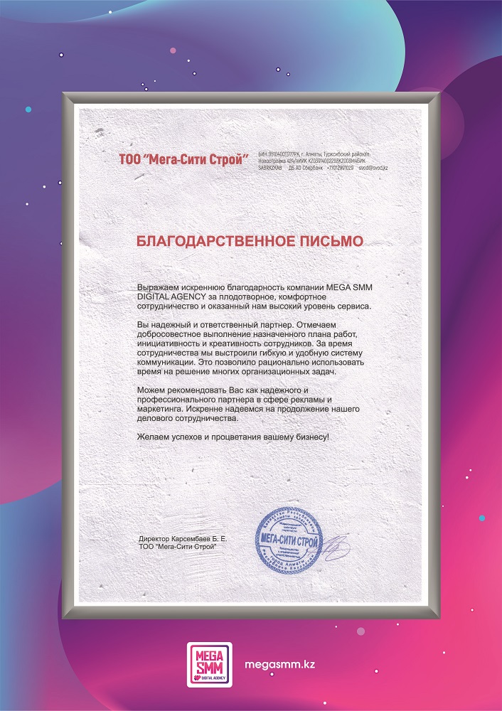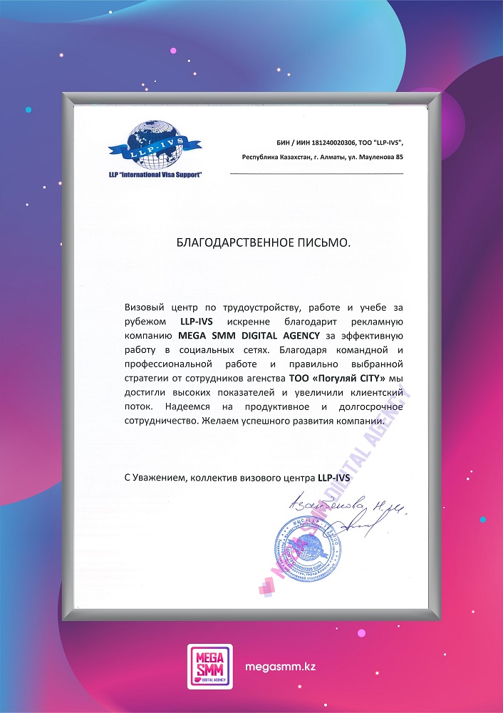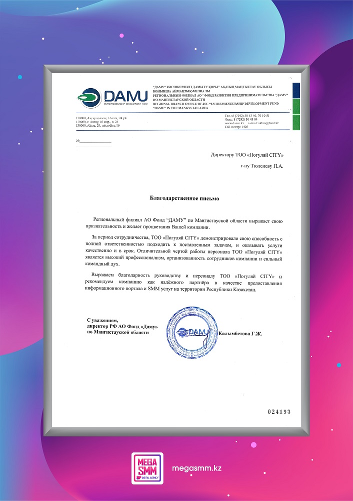Выражаем благодарность руководству и персоналу ТОО «Погуляй CITY» и рекомендуем компанию MEGA SMM, как надежного партнера в качестве предоставления рекламы и SMM услуг на территории Республики Казахстан.