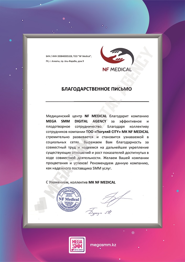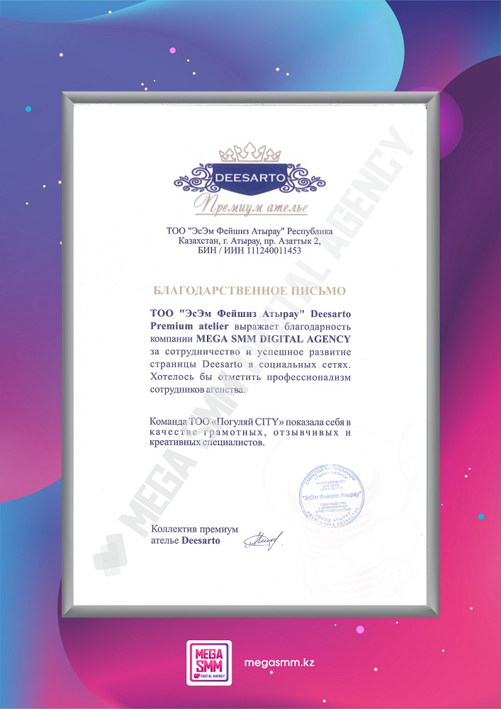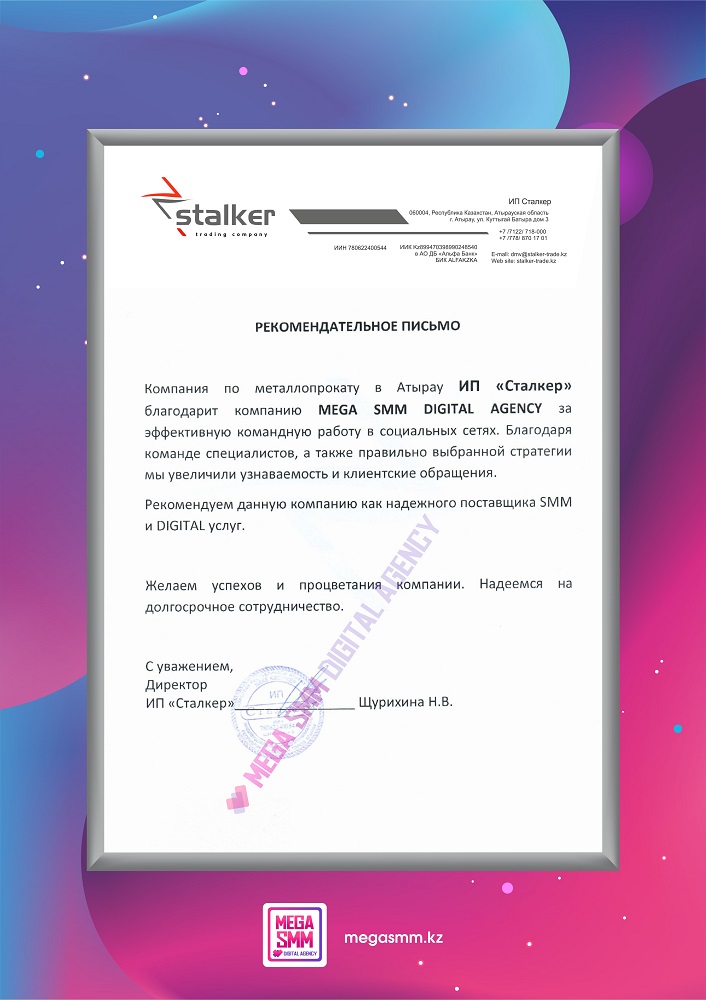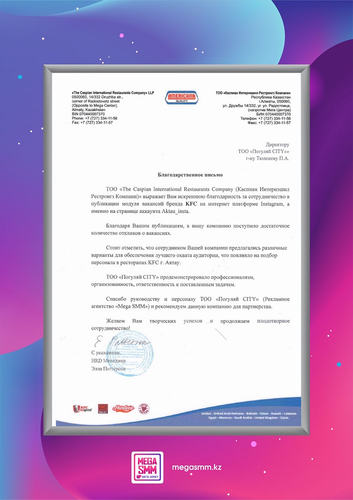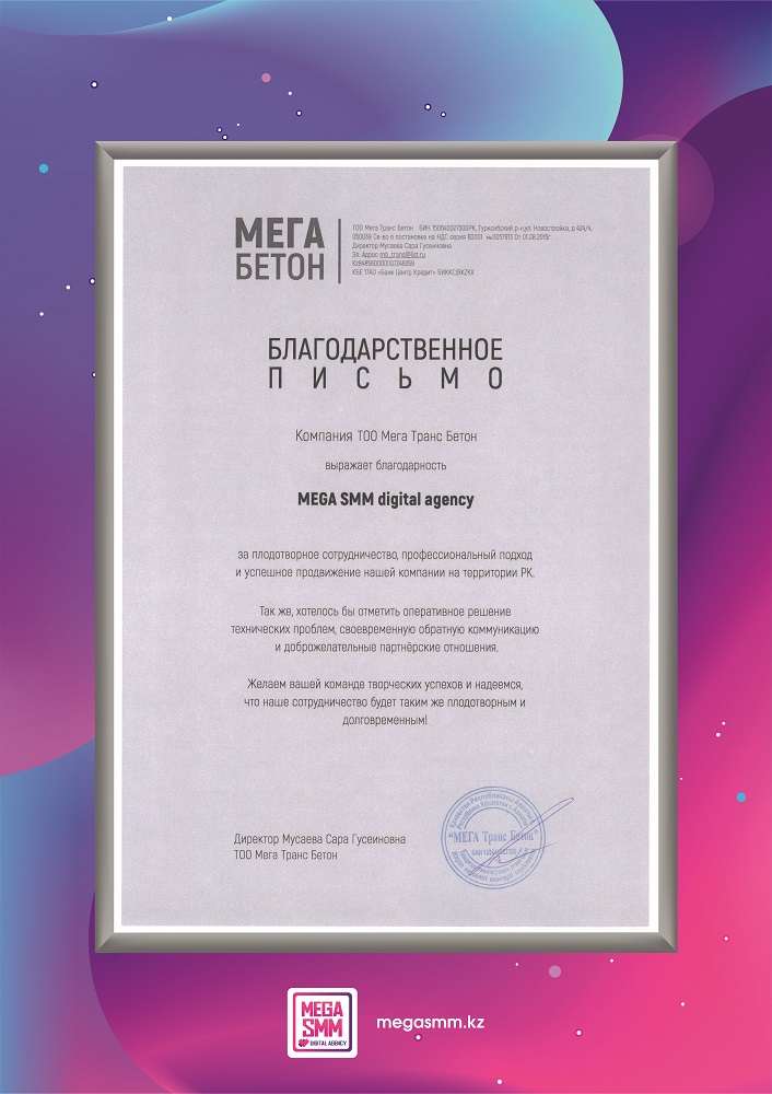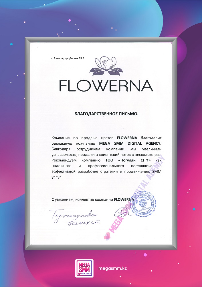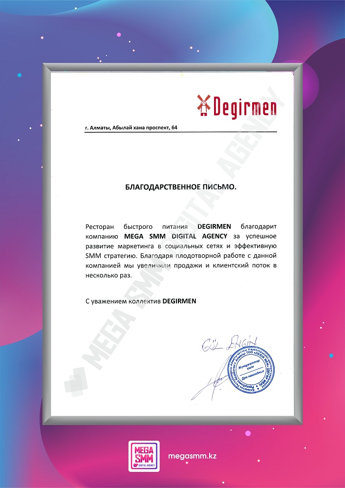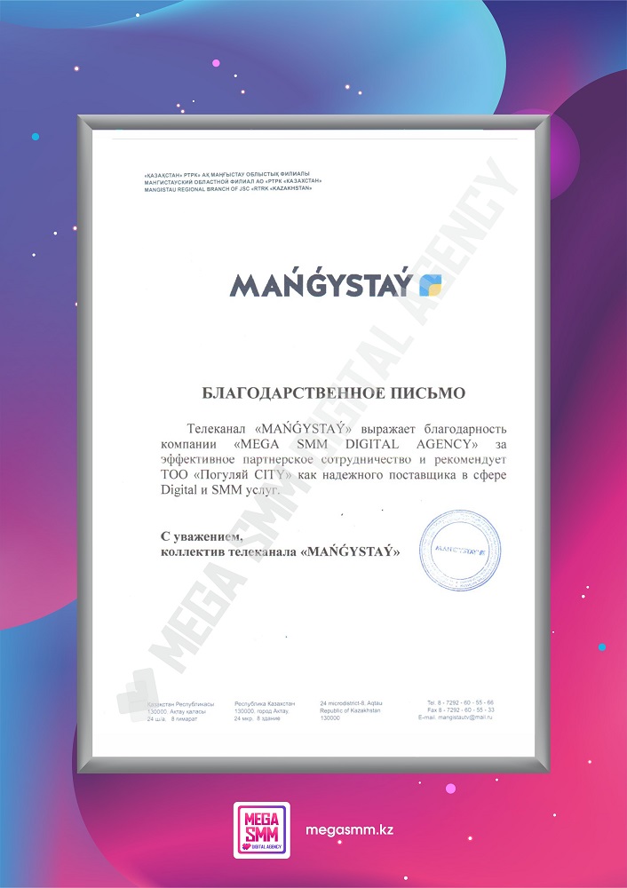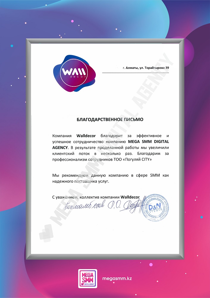 Выражаем благодарность руководству и персоналу ТОО «Погуляй CITY» и рекомендуем компанию MEGA SMM, как надежного партнера в качестве предоставления рекламы и SMM услуг на территории Республики Казахстан.