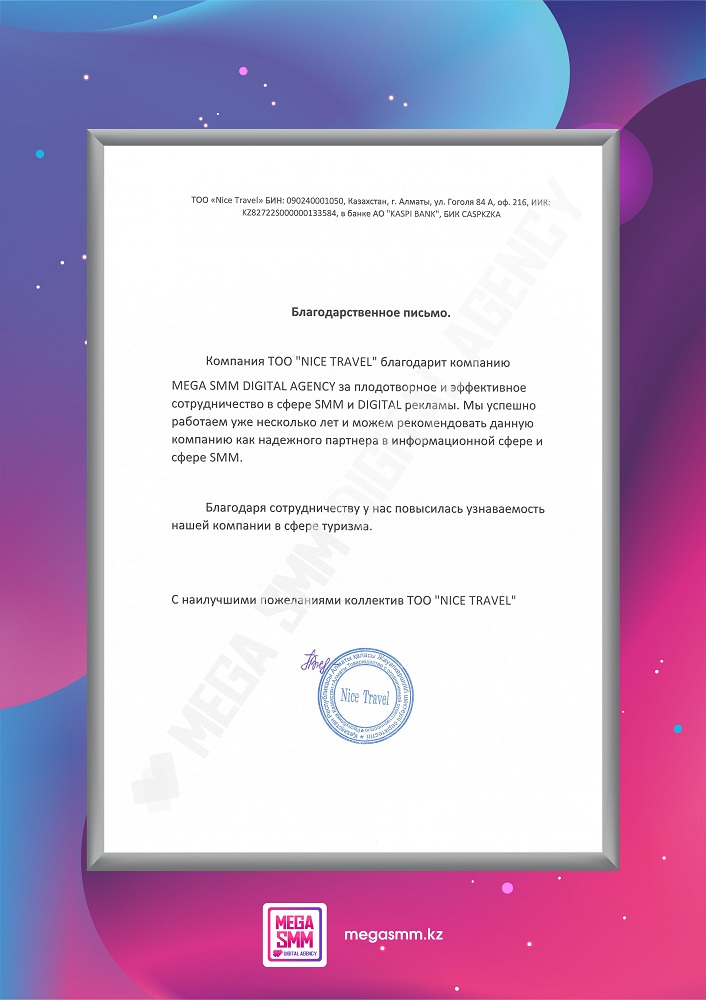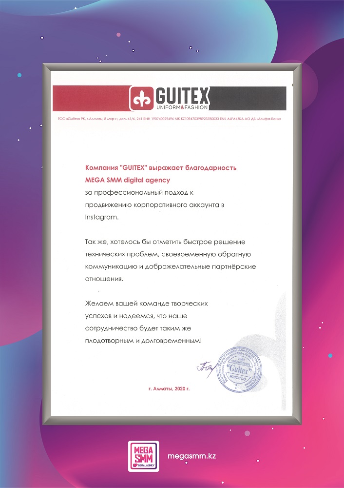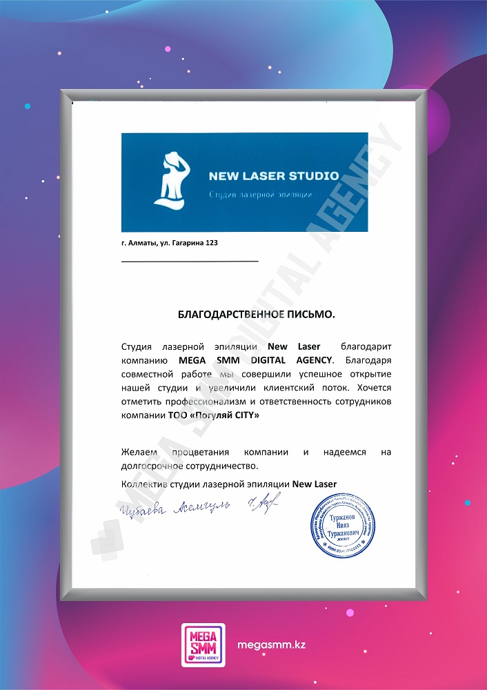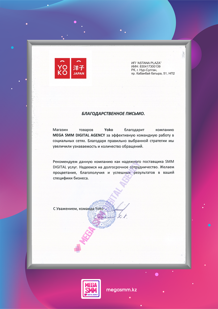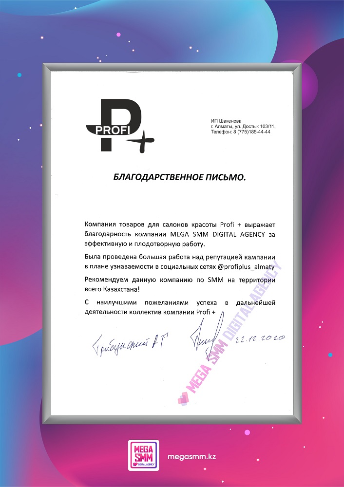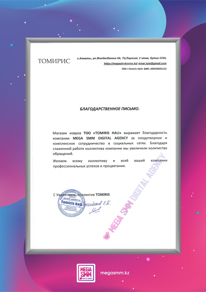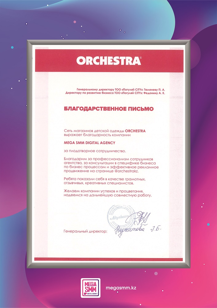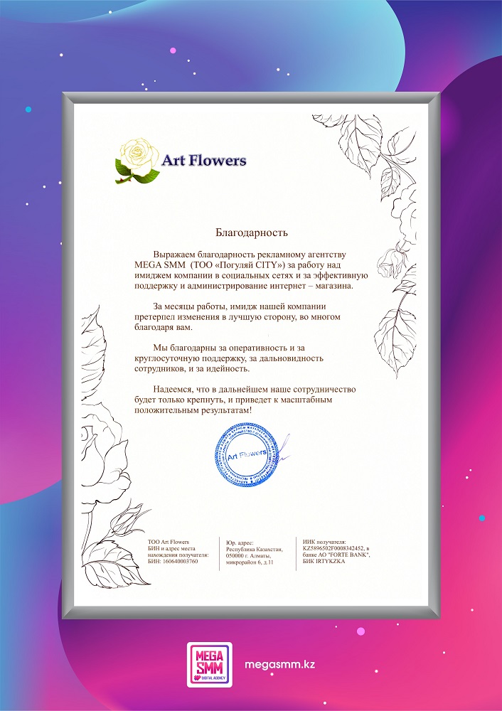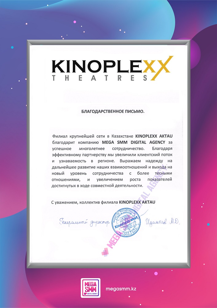 Выражаем благодарность руководству и персоналу ТОО «Погуляй CITY» и рекомендуем компанию MEGA SMM, как надежного партнера в качестве предоставления рекламы и SMM услуг на территории Республики Казахстан.