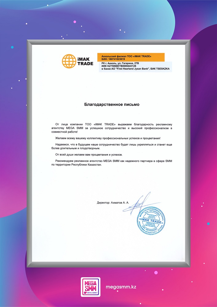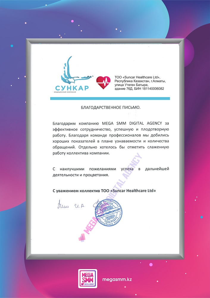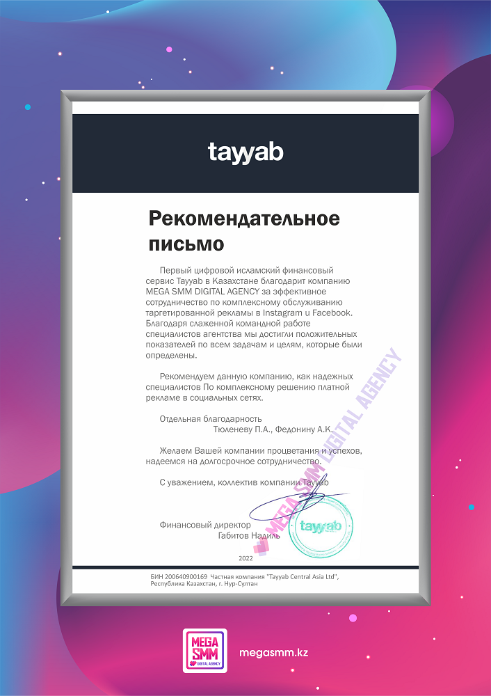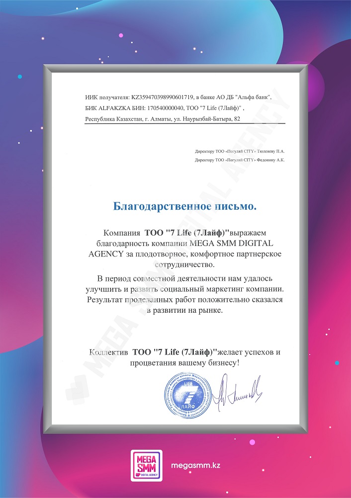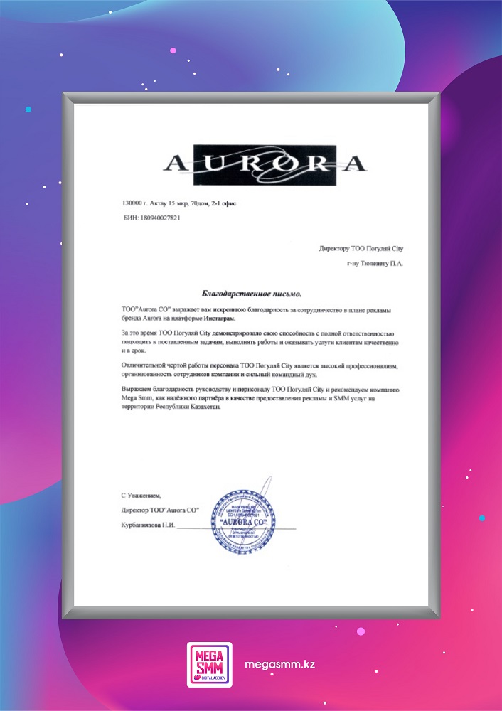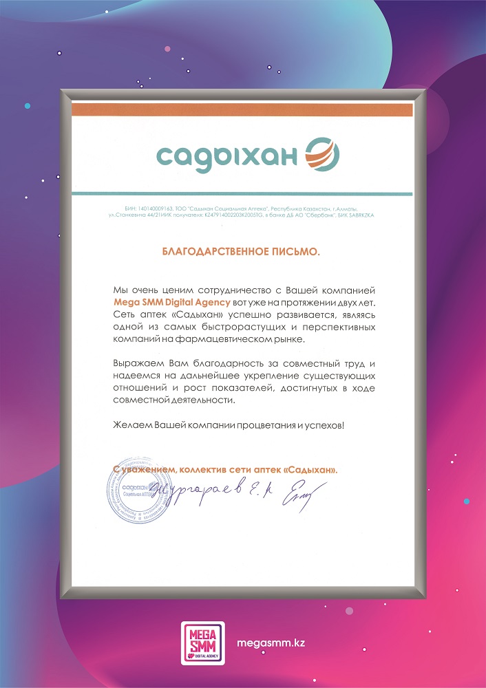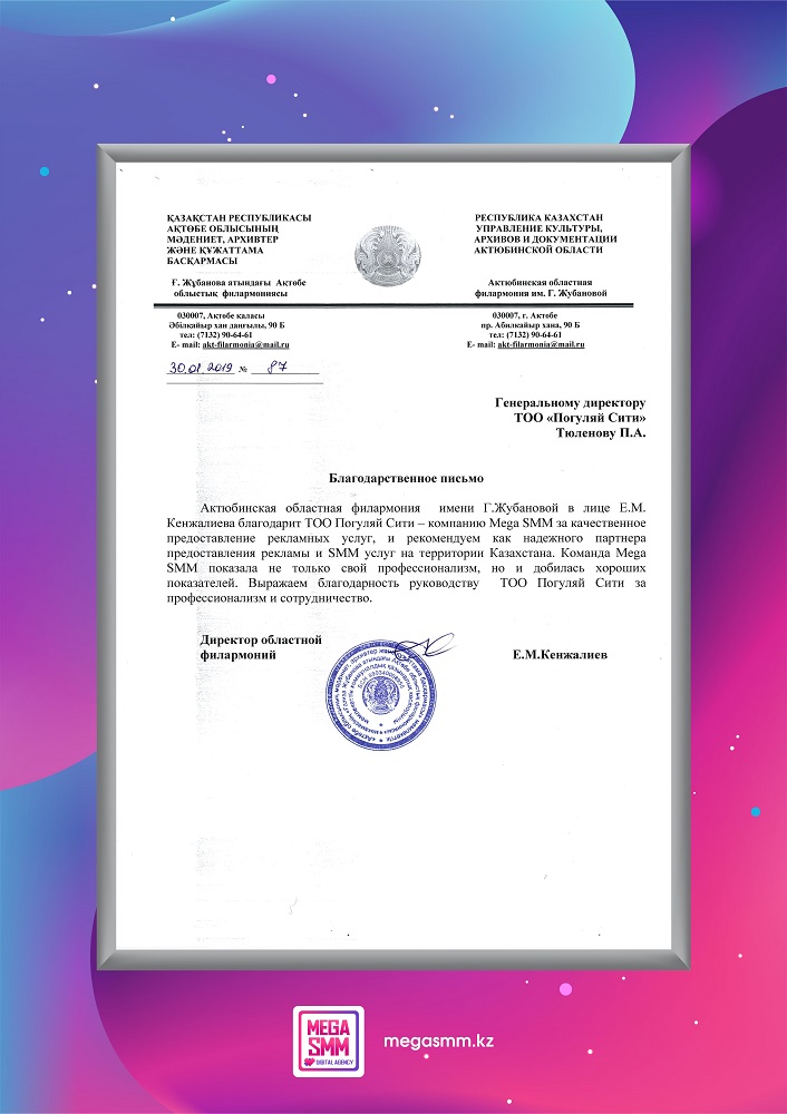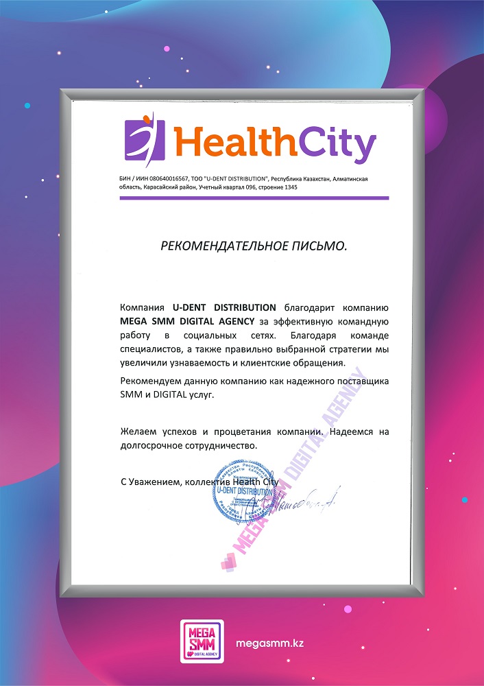 Выражаем благодарность руководству и персоналу ТОО «Погуляй CITY» и рекомендуем компанию MEGA SMM, как надежного партнера в качестве предоставления рекламы и SMM услуг на территории Республики Казахстан.
