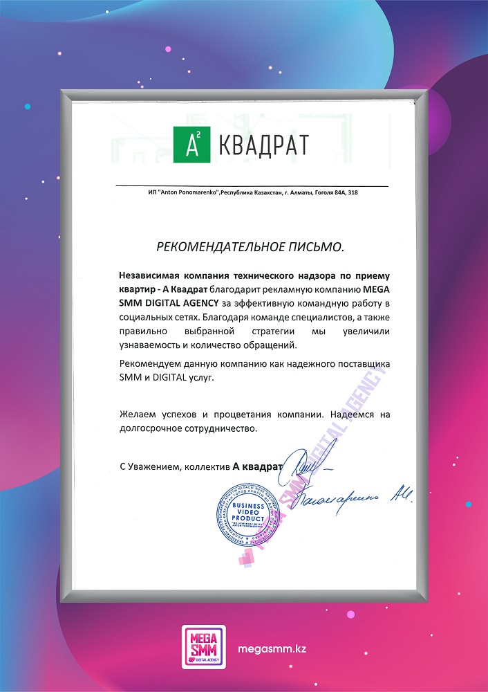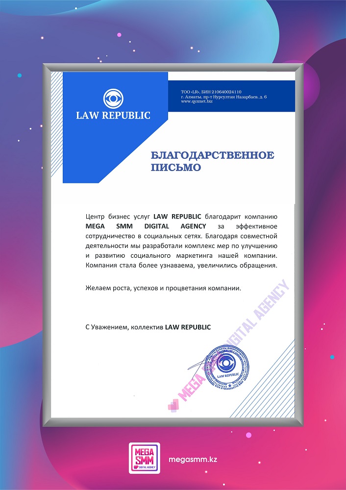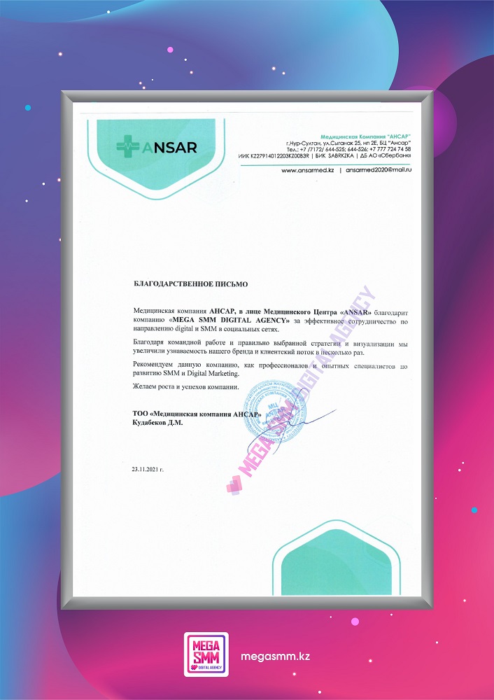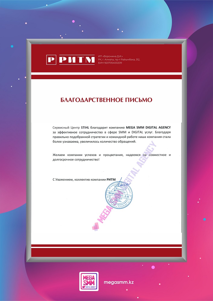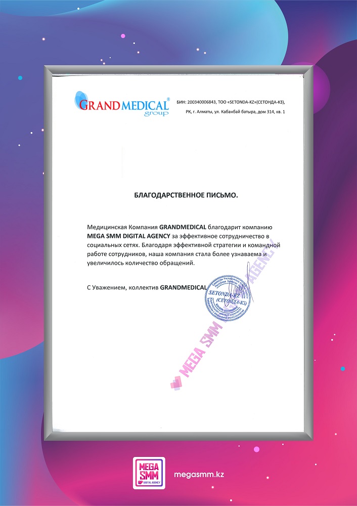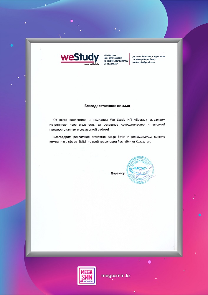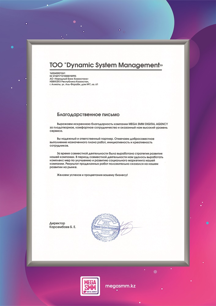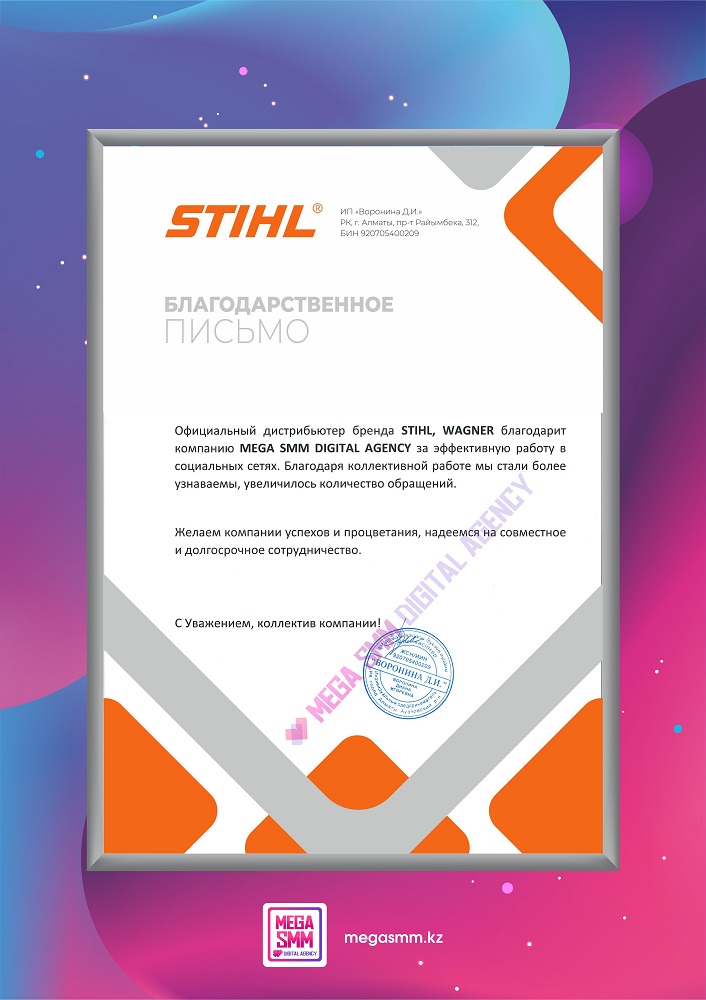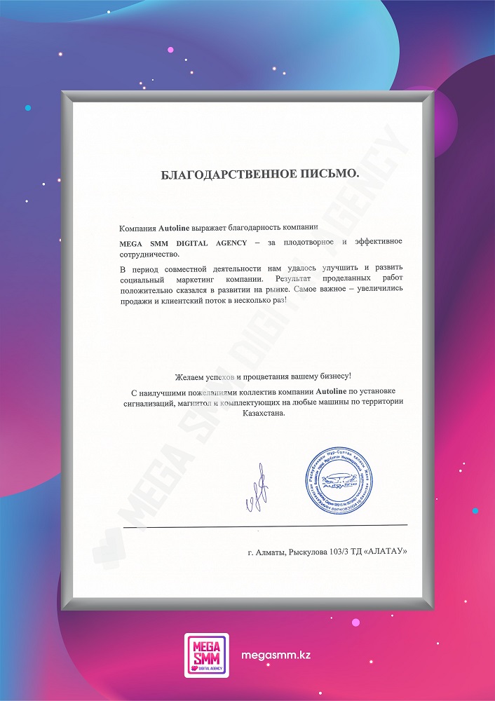 Выражаем благодарность руководству и персоналу ТОО «Погуляй CITY» и рекомендуем компанию MEGA SMM, как надежного партнера в качестве предоставления рекламы и SMM услуг на территории Республики Казахстан.