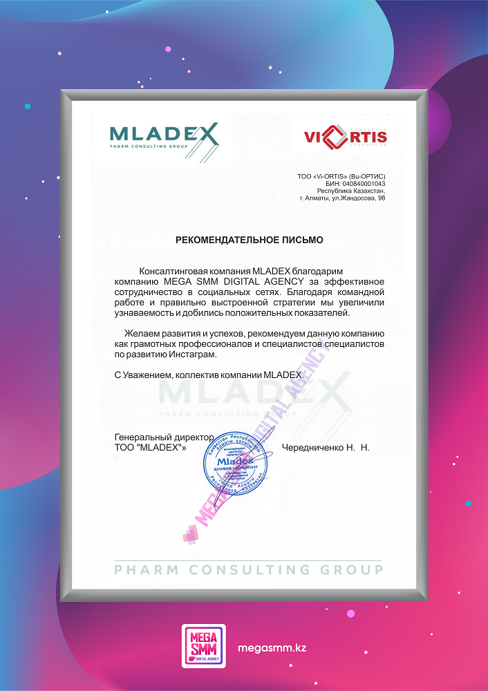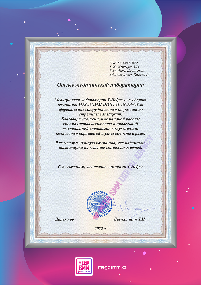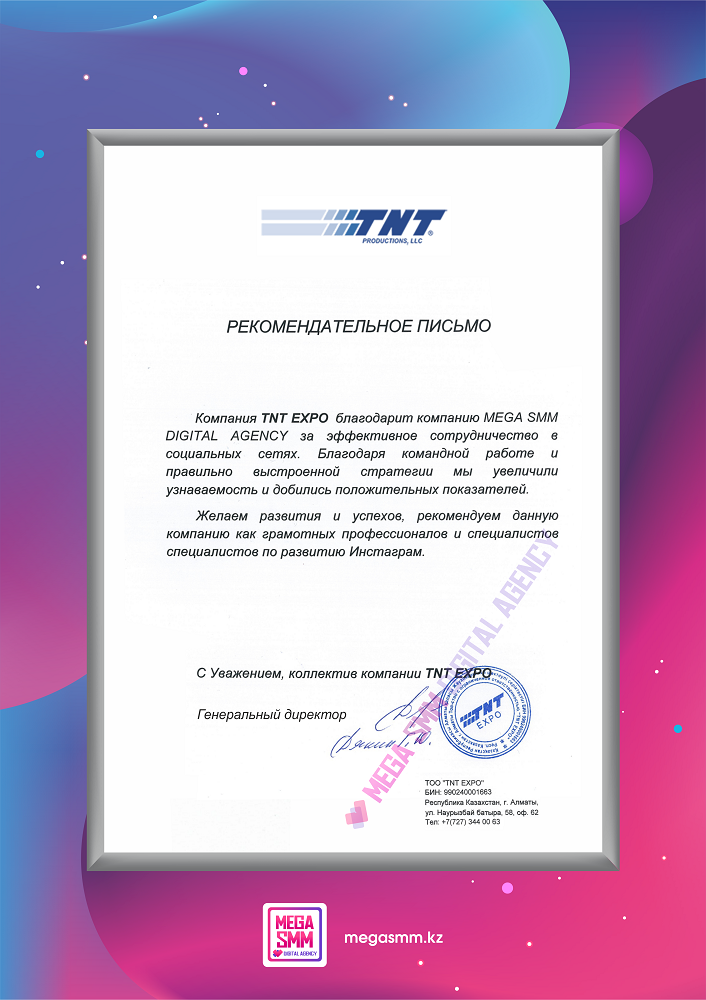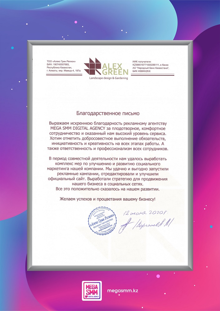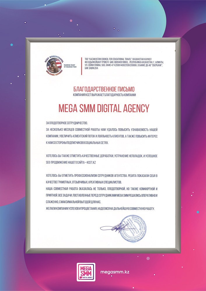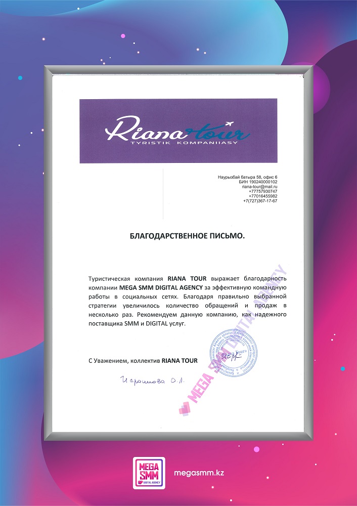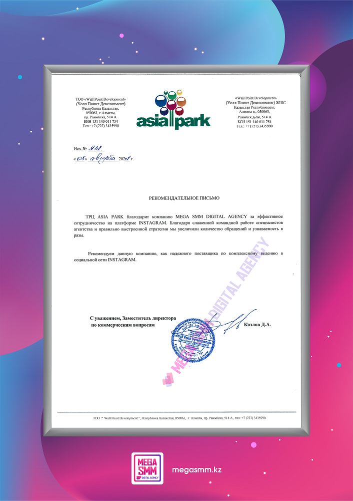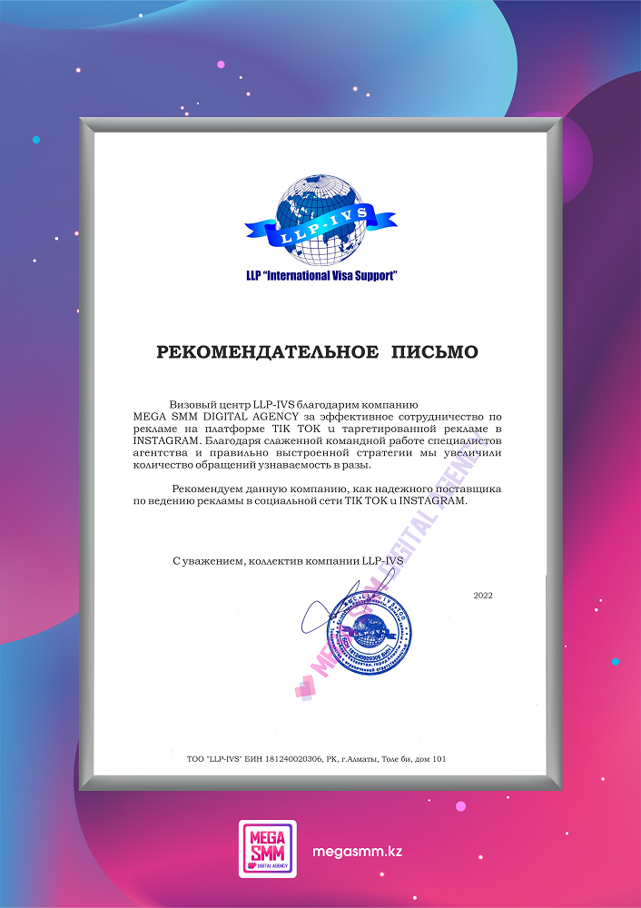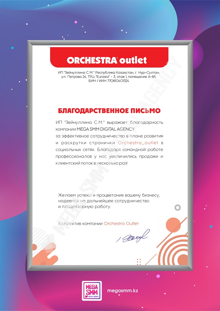 Выражаем благодарность руководству и персоналу ТОО «Погуляй CITY» и рекомендуем компанию MEGA SMM, как надежного партнера в качестве предоставления рекламы и SMM услуг на территории Республики Казахстан.