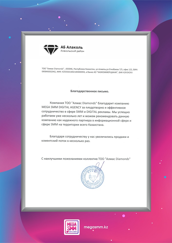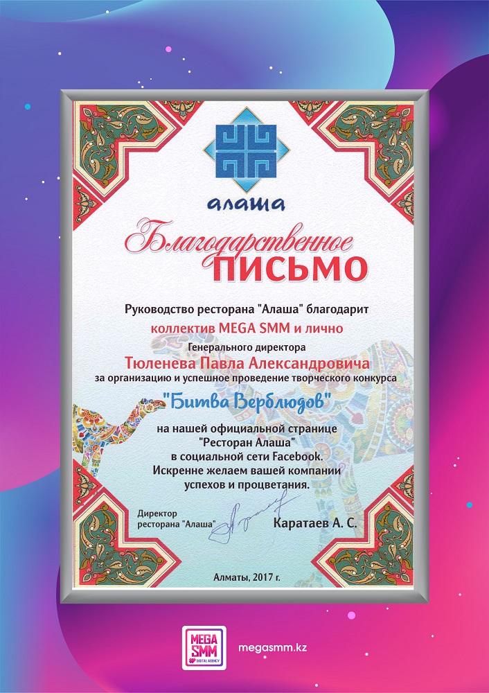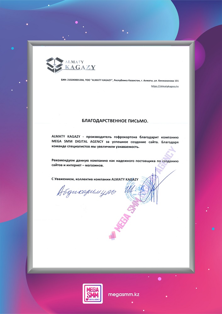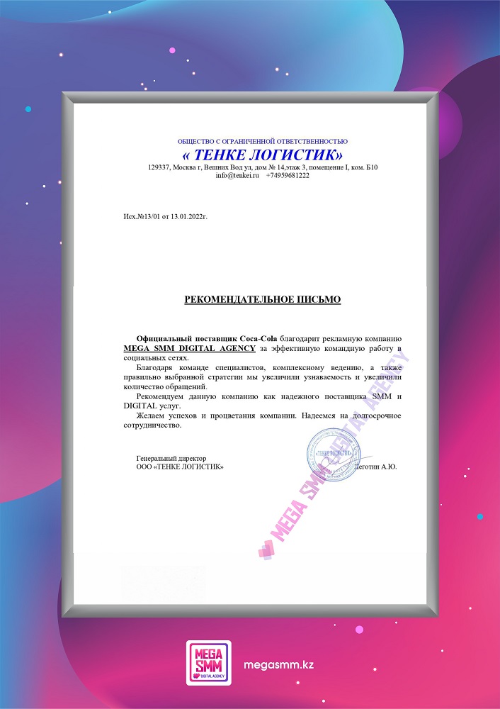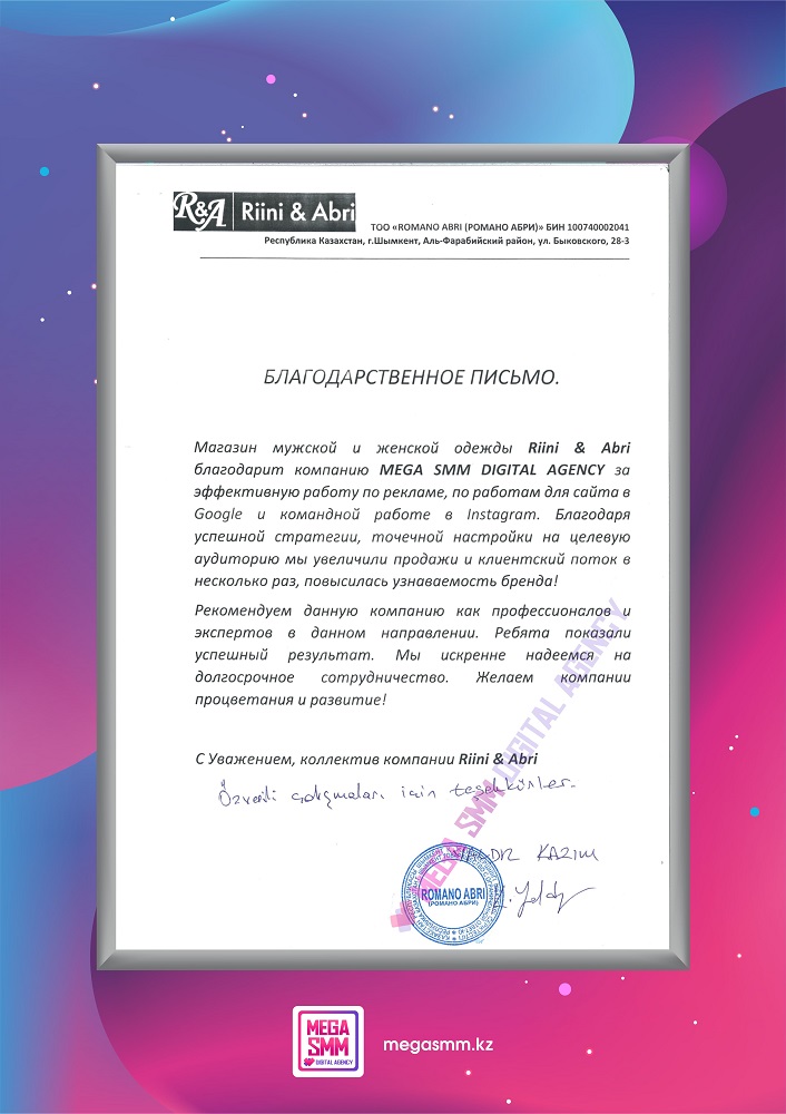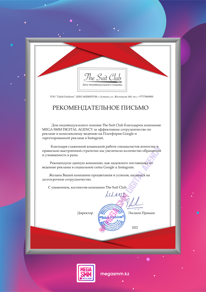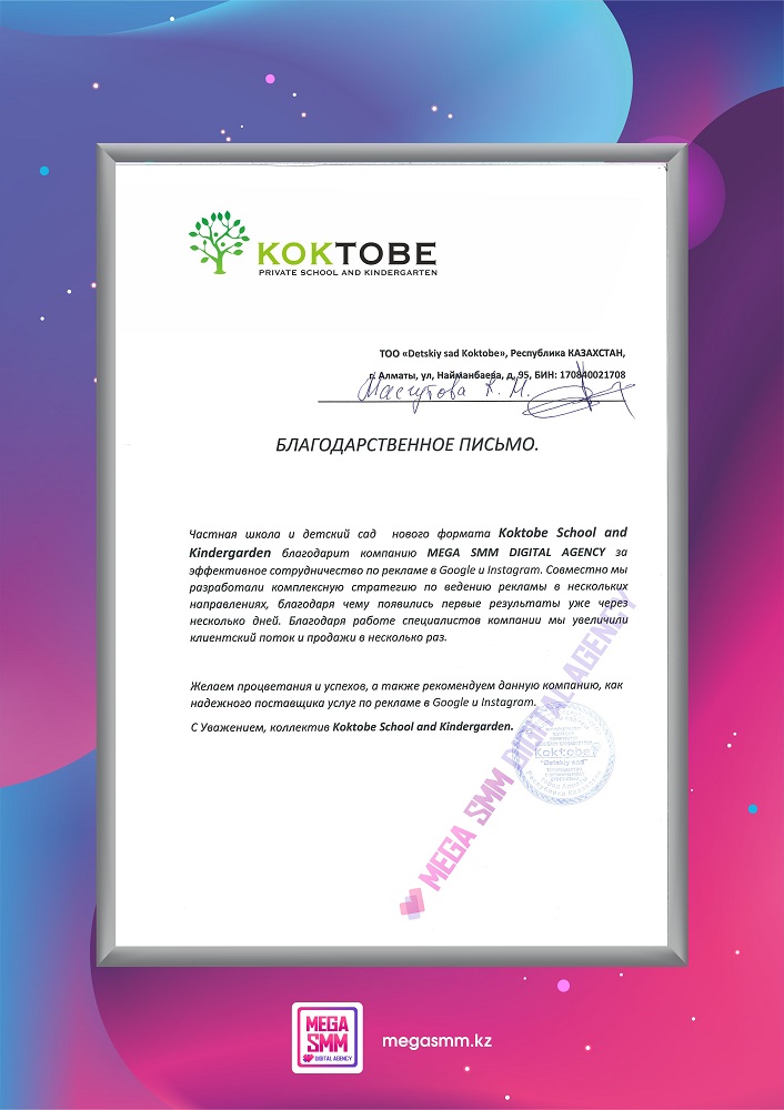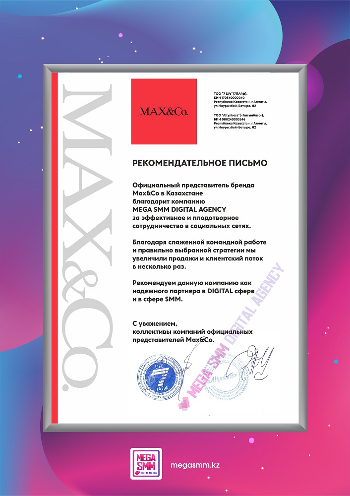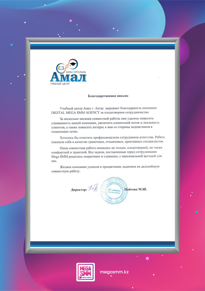 Выражаем благодарность руководству и персоналу ТОО «Погуляй CITY» и рекомендуем компанию MEGA SMM, как надежного партнера в качестве предоставления рекламы и SMM услуг на территории Республики Казахстан.