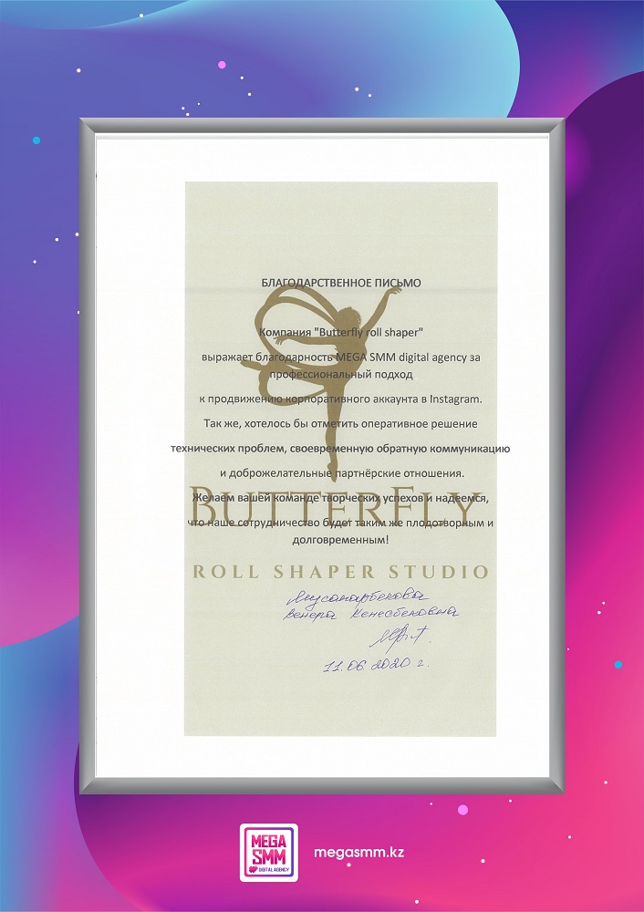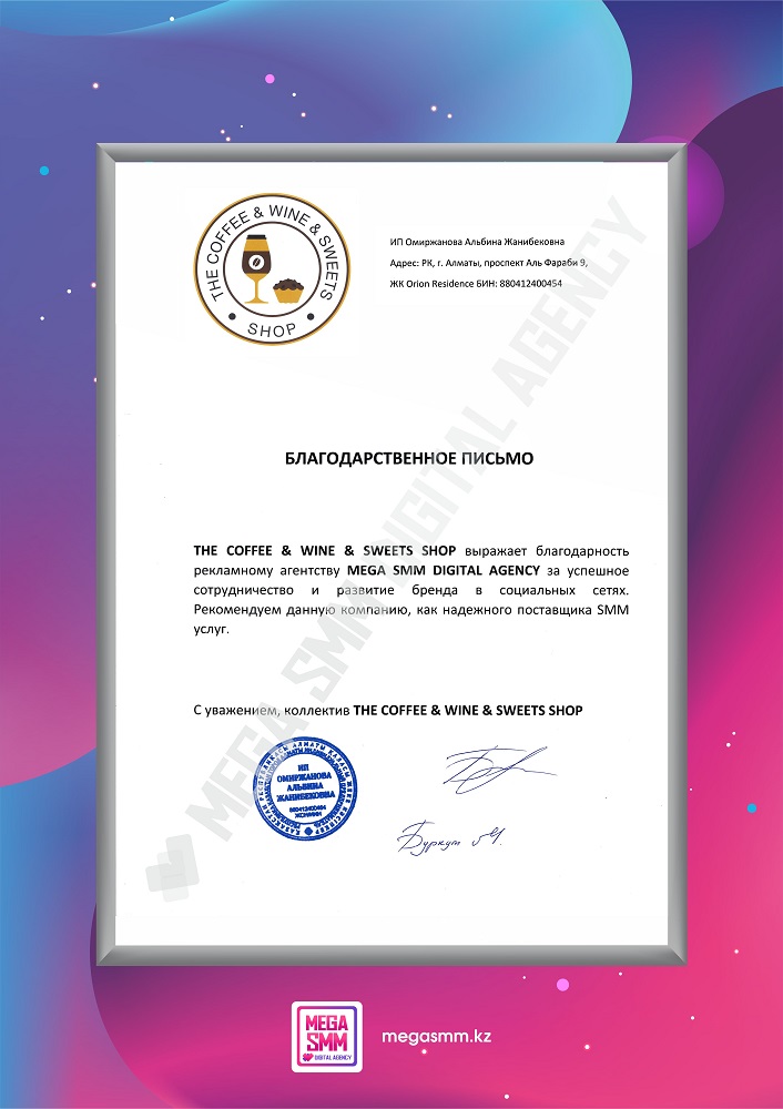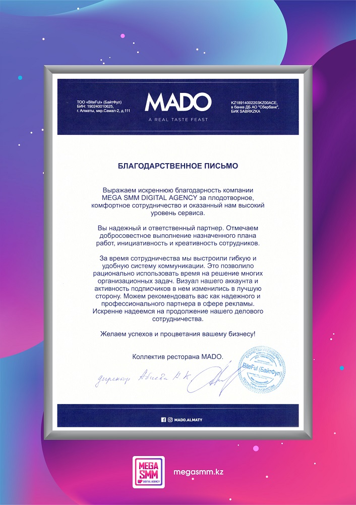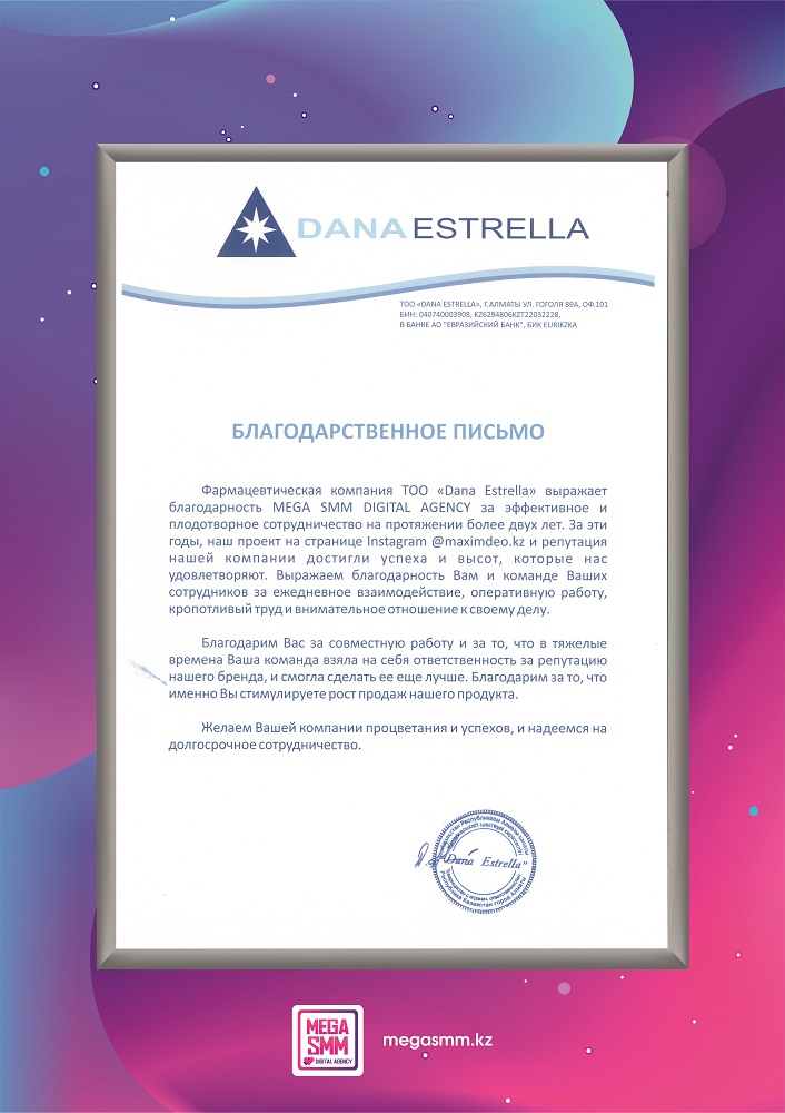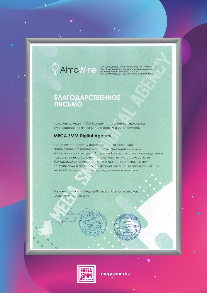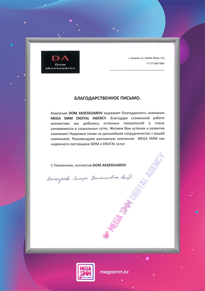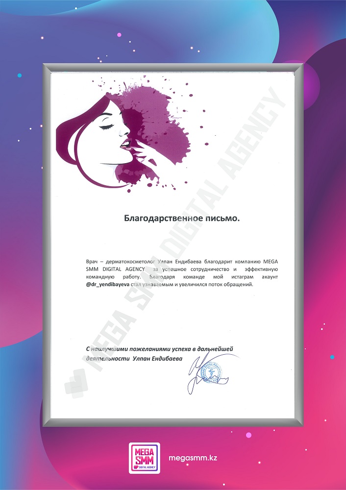 Благодарность MEGA SMM DIGITAL AGENCY за эффективное и плодотворное сотрудничество на протяжении более двух лет, за ежедневное взаимодействие, оперативную работу, кропотливый труд и внимательное отношение к своему делу. За эти годы, наш проект на странице Instagram достигли успеха и высот, которые нас удовлетворяют.