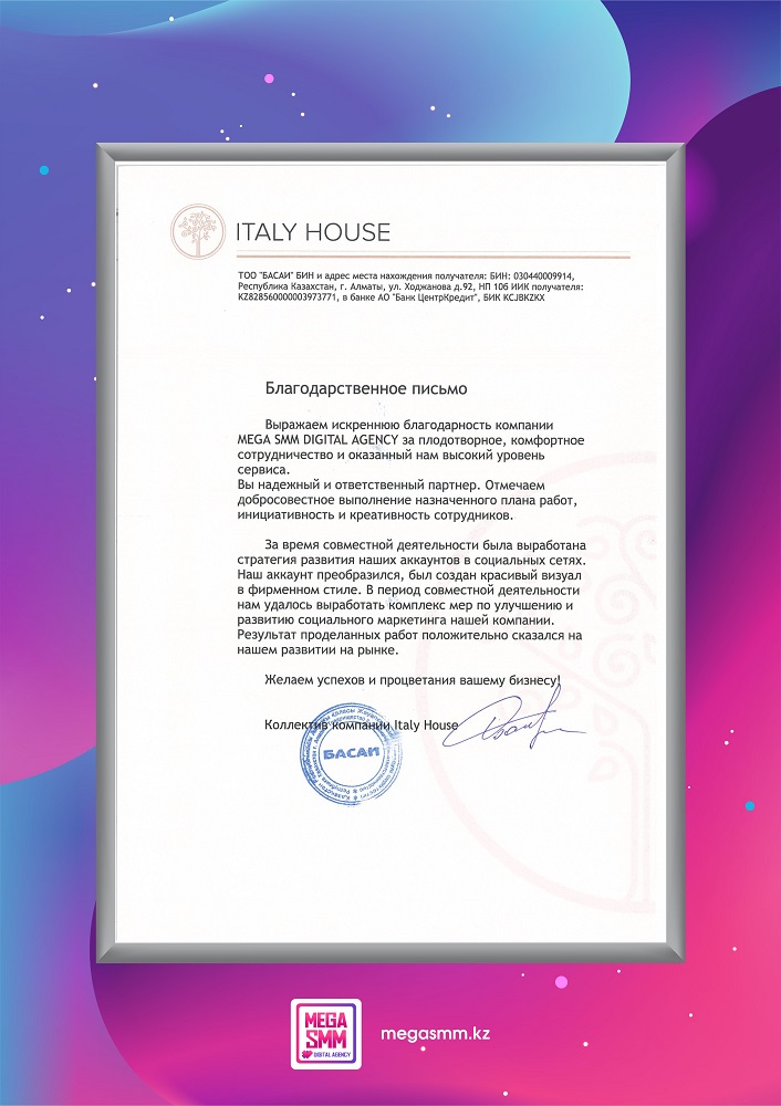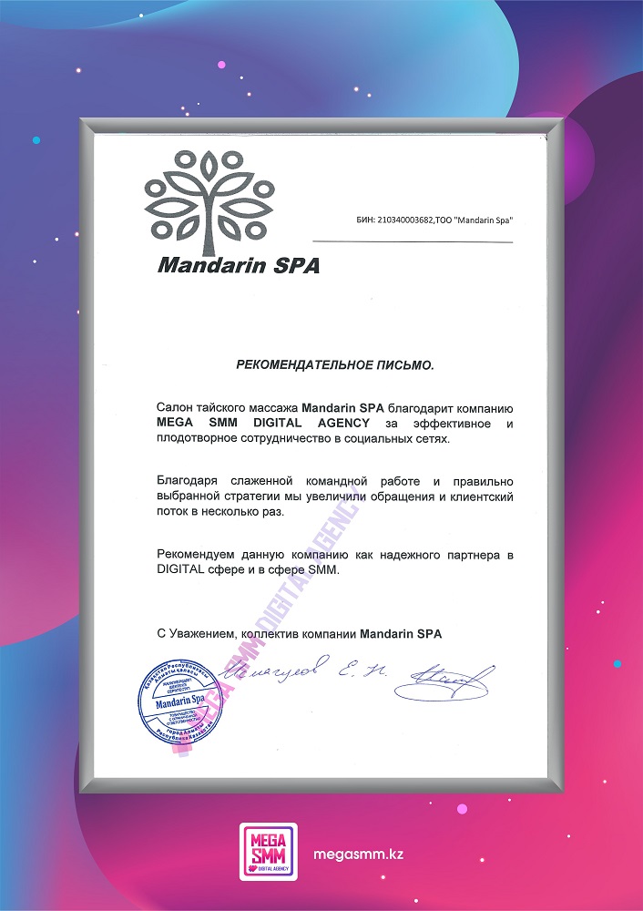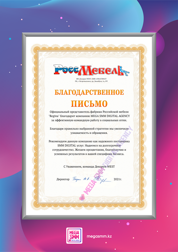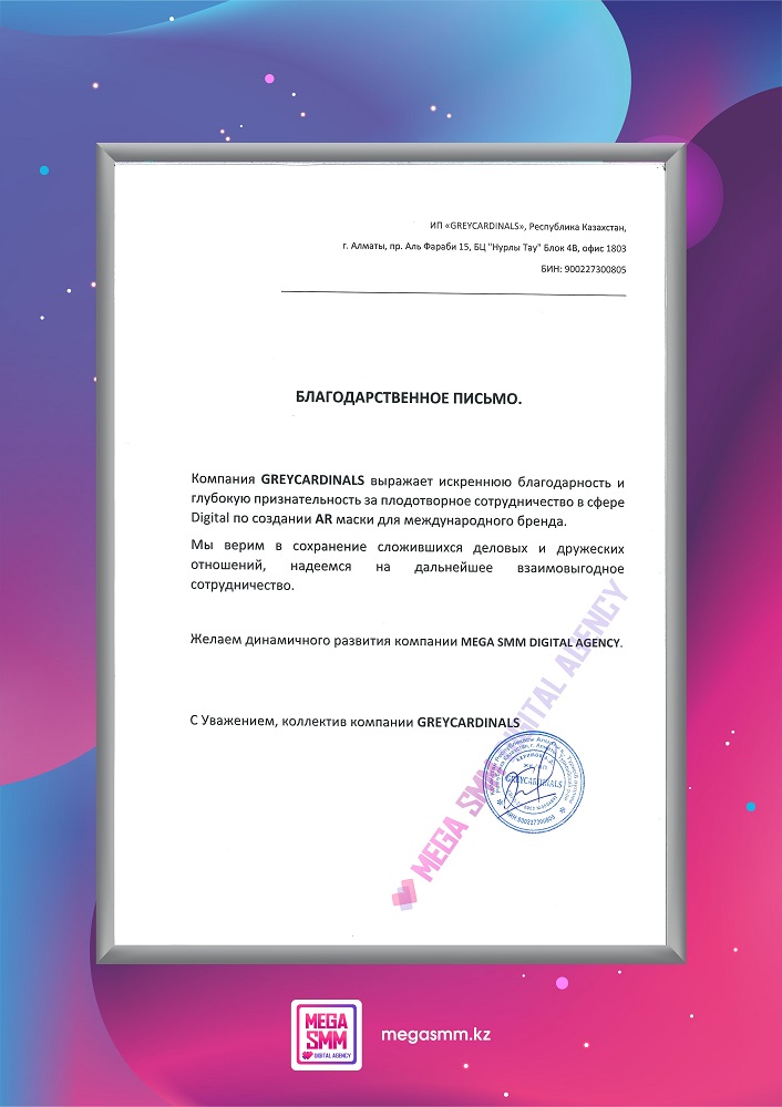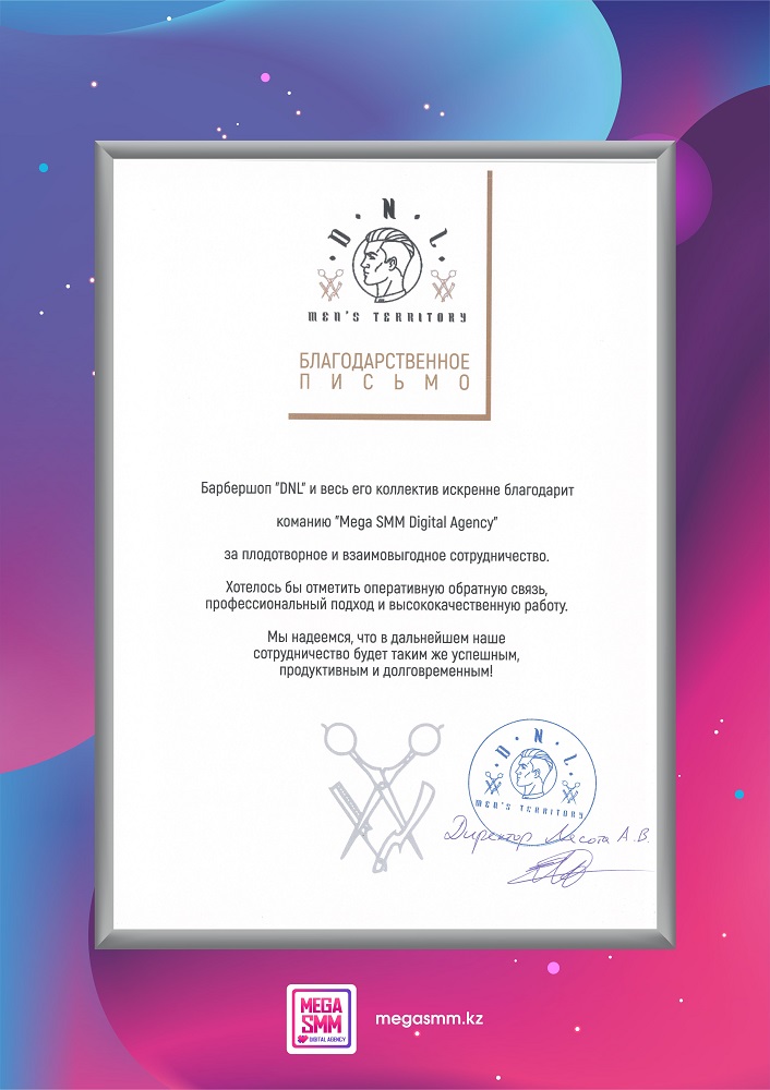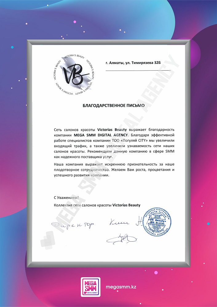 Благодарность MEGA SMM DIGITAL AGENCY за эффективное и плодотворное сотрудничество на протяжении более двух лет, за ежедневное взаимодействие, оперативную работу, кропотливый труд и внимательное отношение к своему делу. За эти годы, наш проект на странице Instagram достигли успеха и высот, которые нас удовлетворяют.