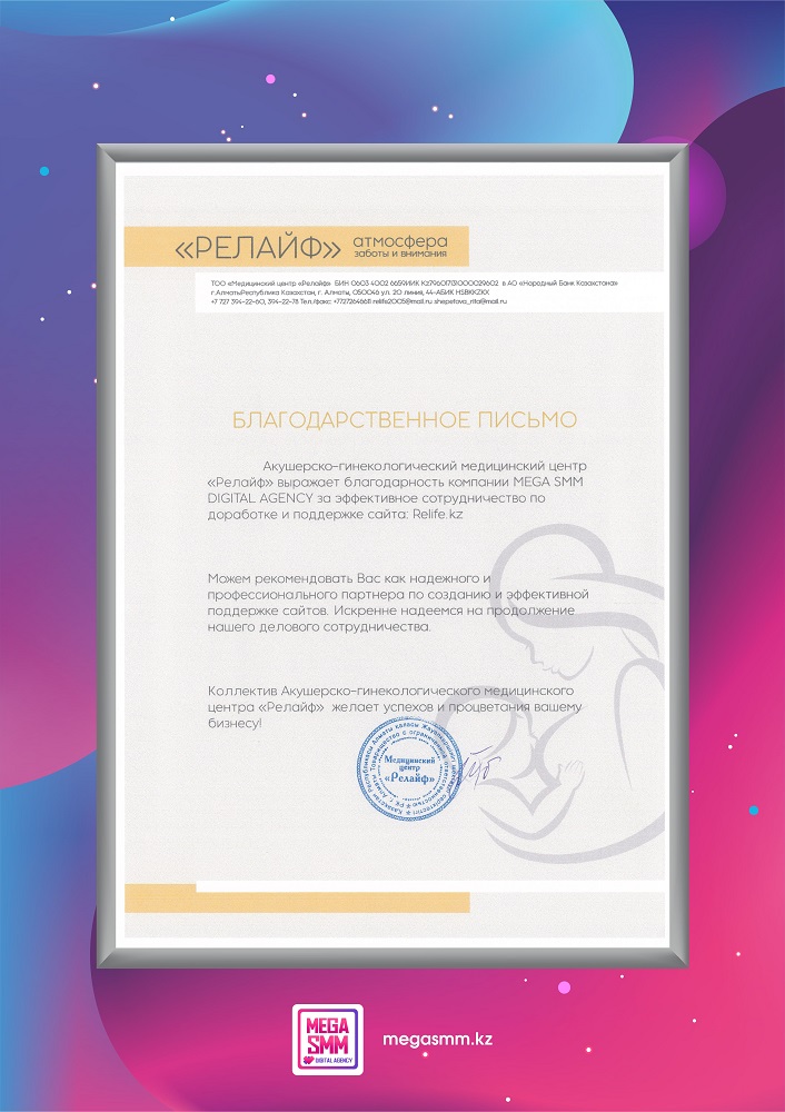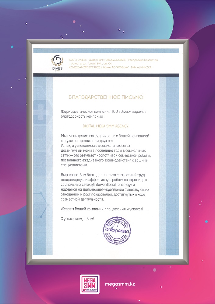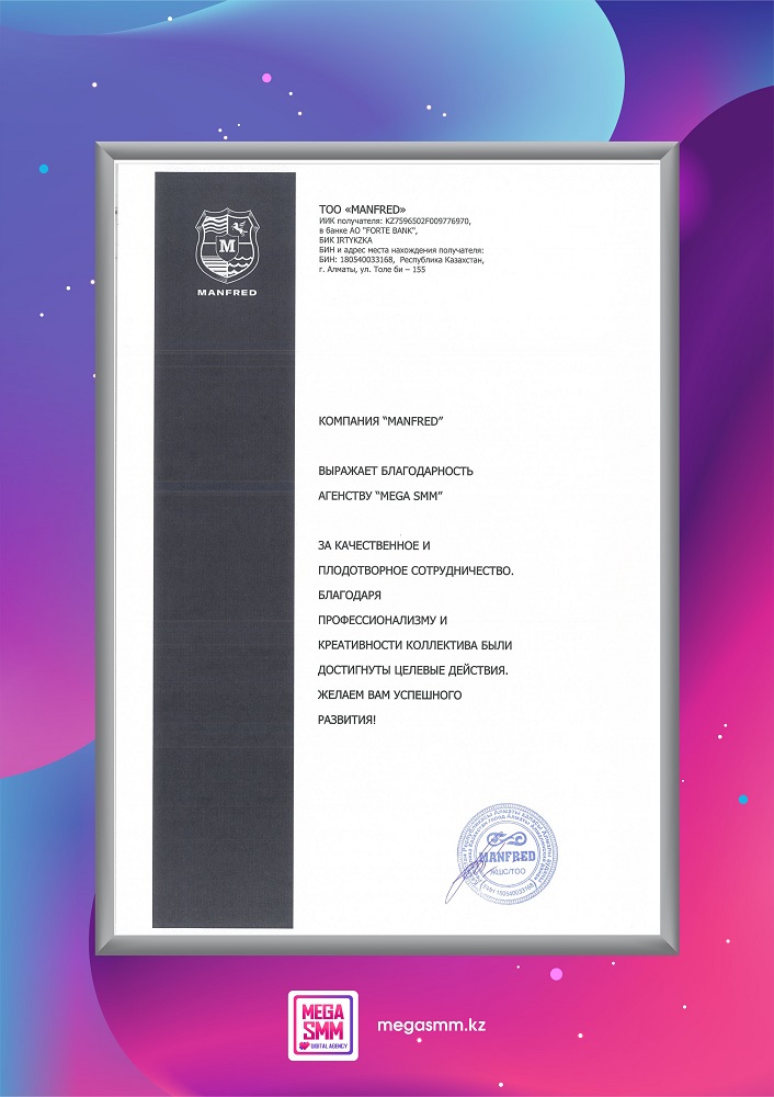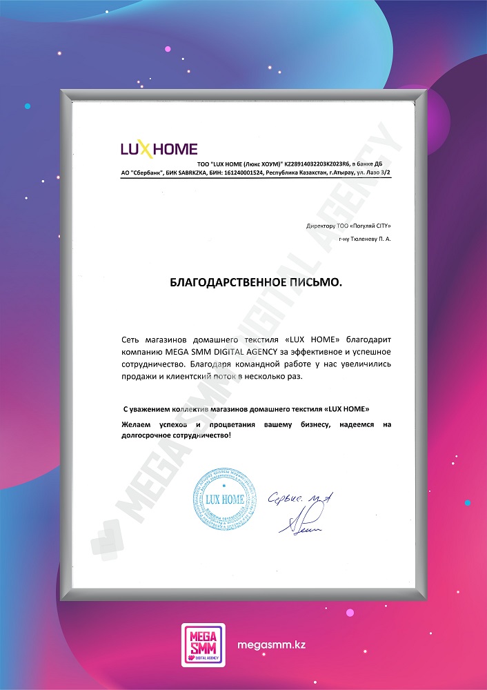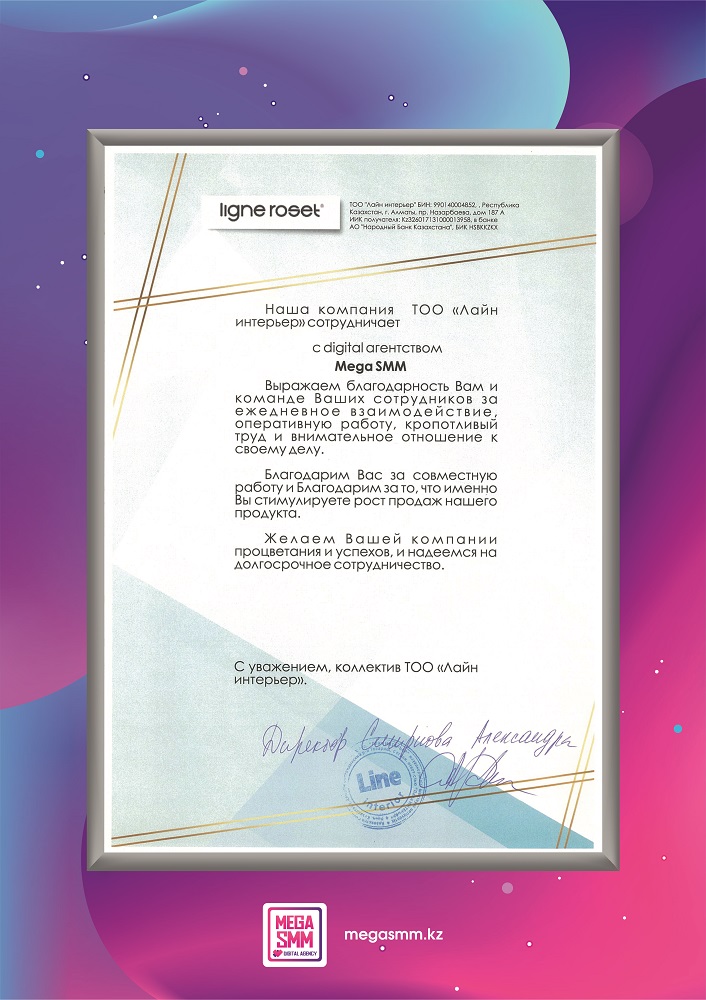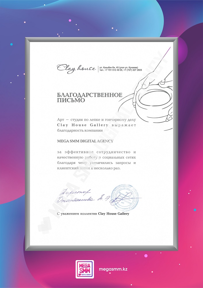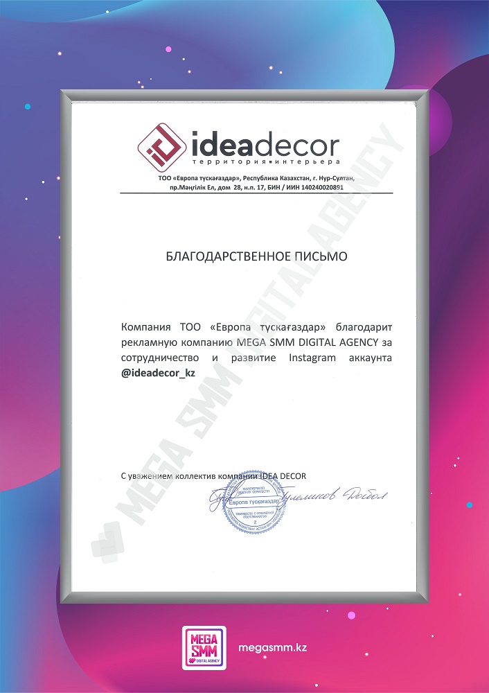 Благодарность MEGA SMM DIGITAL AGENCY за эффективное и плодотворное сотрудничество на протяжении более двух лет, за ежедневное взаимодействие, оперативную работу, кропотливый труд и внимательное отношение к своему делу. За эти годы, наш проект на странице Instagram достигли успеха и высот, которые нас удовлетворяют.