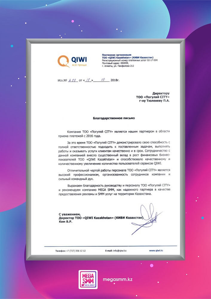 Сотрудничество с компанией Mega SMM внесло существенный вклад в рост финансовых бизнес-показателей ТОО «Qiwi Kazakhstan» и способствовало качественному и количественному увеличению количества пользователей сервисов QIWI.